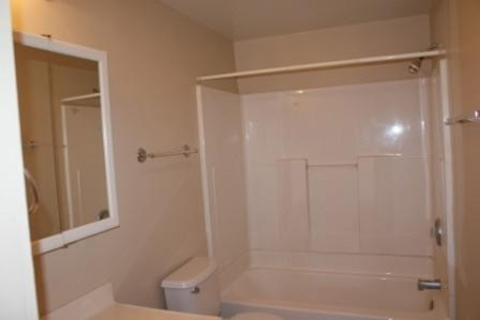 Bath with newer tile, vanity, one piece tub unit, and toilet